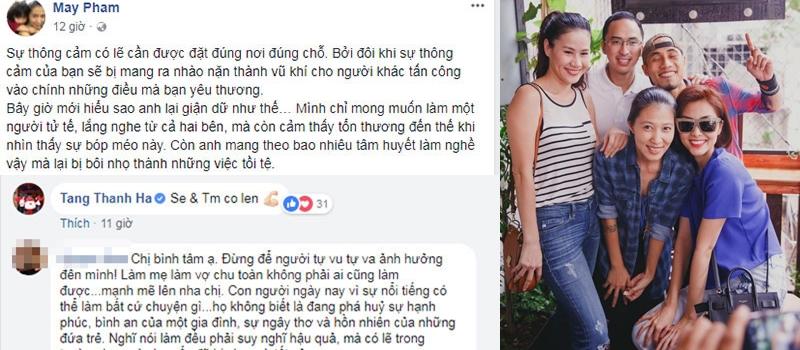 Lời than thở của Thùy Trang giữa scandal bạn đời bị tố gạ tình đã nhận được nhiều lời sẻ chia. Trong số đó, lời động viên vợ chồng Phạm Anh Khoa "cố lên" vượt qua ồn ào tình ái của Tăng Thanh Hà đã nhận được sự quan tâm lớn. Cựu "ngọc nữ" để lại bình luận bên dưới chia sẻ của bà xã rocker họ Phạm: "Sẻ và TM cố lên" - Sẻ là biệt danh của Thùy Trang còn TM là tên thường gọi của Phạm Anh Khoa.