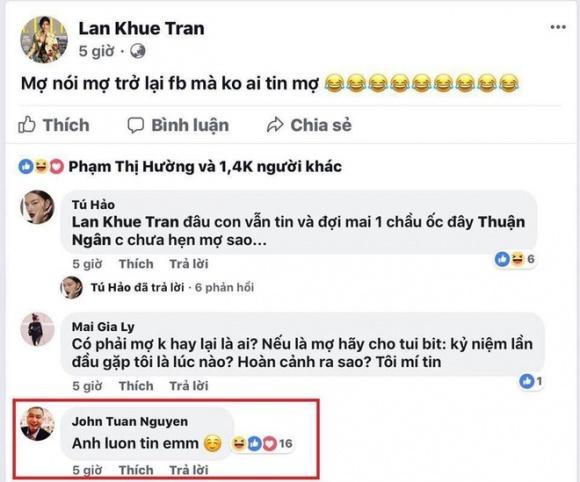 Cách đây không lâu, khi Lan Khuê lấy lại trang cá nhân gần 1 triệu người theo dõi, vị doanh nhân này không ngần ngại vào tận "nhà" người đẹp chúc mừng bằng dòng bình luận mùi mẫn: "Anh luôn tin em".