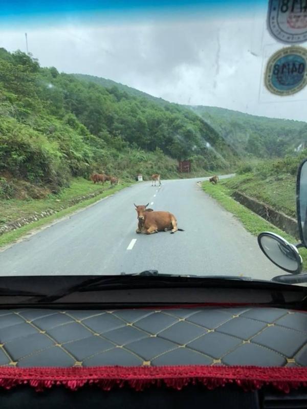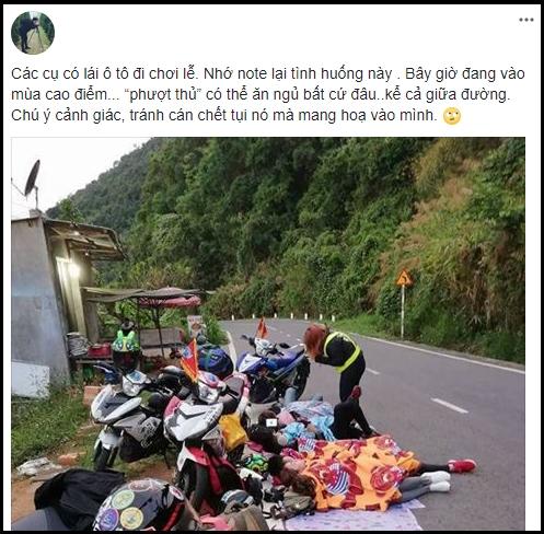 Đoàn phượt nằm chiếm hết một nửa làn đường đi lên.
