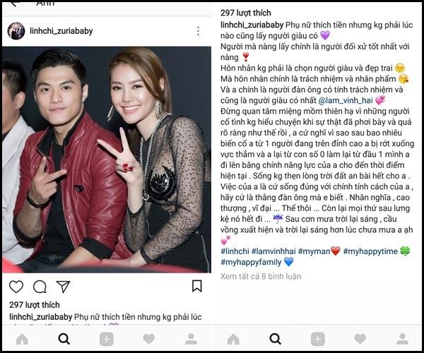 Kèm theo đó, Linh Chi gắn rất nhiều biểu tượng trái tim khi nhắc đến dancer họ Lâm. Để thổ lộ tình cảm, chân dài 28 tuổi còn dùng nhiều hashtag ý nghĩa như #myman (người đàn ông của tôi), #myhappytime (thời gian hạnh phúc của tôi) hay #myhappyfamily (gia đình hạnh phúc của tôi).