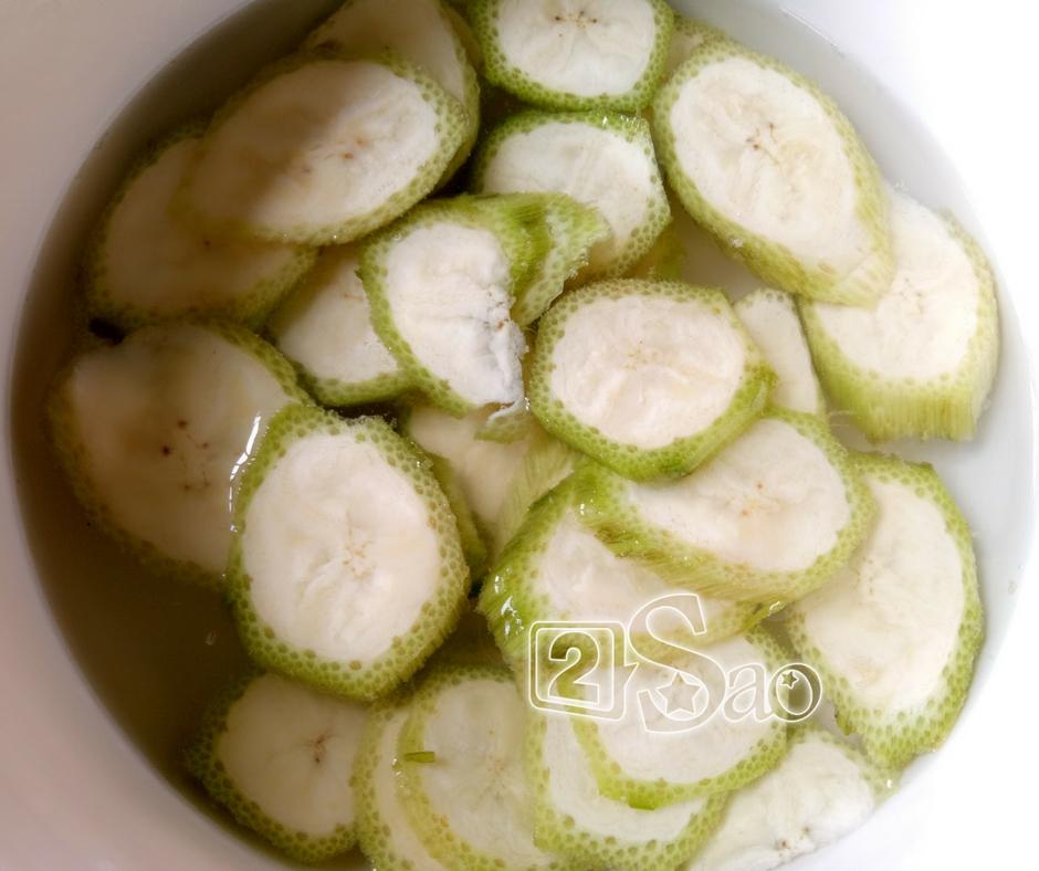 Bước 2: Chuối xanh tước vỏ, thái mỏng và ngâm vào âu nước lọc có pha thêm ít muối và vài giọt nước chanh để chuối không bị thâm