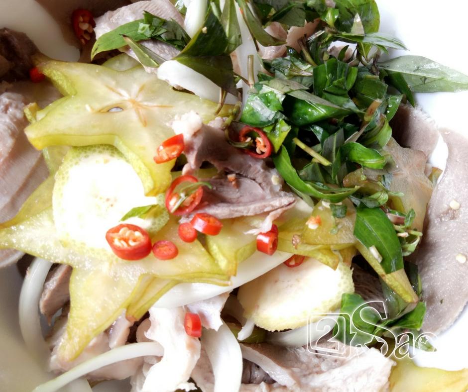 Bước 6: Cho hành tây, chuối xanh, khế chua và lưỡi lợn vào âu rồi từ từ rưới phần nước mắm trộn lên cùng ít rau răm thái nhỏ, để khoảng 5 phút sau hỗn hợp ngấm vị là thưởng thức được nhé.