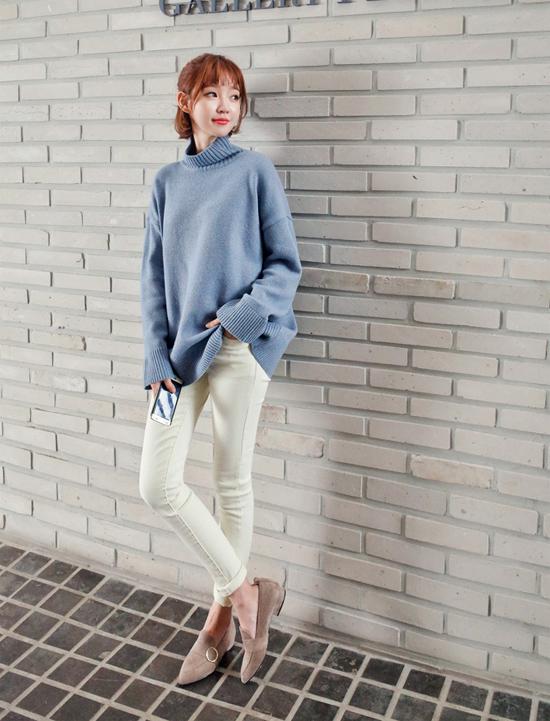Một cô nàng có chiều cao lý tưởng và đôi chân thon gọn thì hãy lên ý tưởng cho ngày đi làm với áo len cổ lọ dáng suông kết hợp quần skinny trắng. Bạn sẽ gây chú ý về diện mạo ấn tượng và thời thượng.