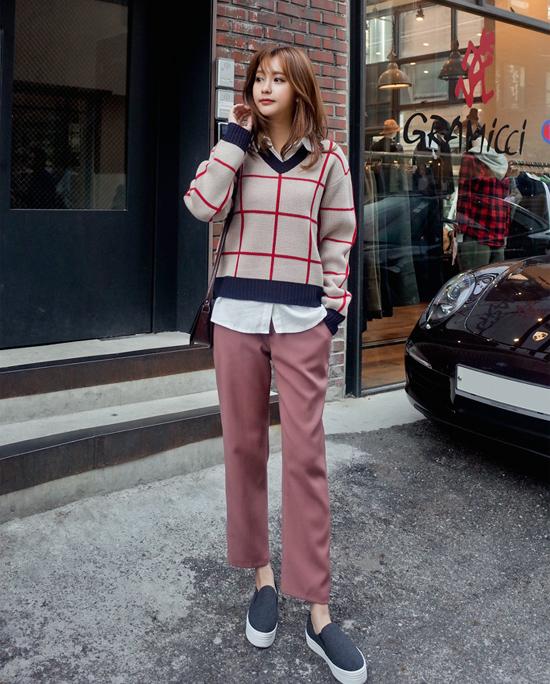 Cách kết hợp layer giữa áo len dệt kim kẻ sọc với áo sơ mi trắng bên trong cũng là ý tưởng tuyệt vời cho bất cứ bạn gái trẻ nào. Thêm chiếc quần tây màu hồng dáng đứng và giày slip on sẽ càng giúp chủ nhân thu hút mọi ánh mắt của đồng nghiệp.