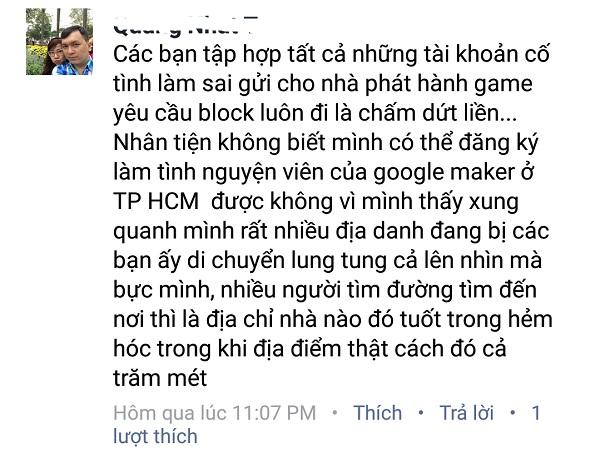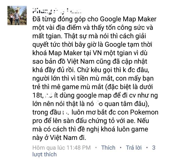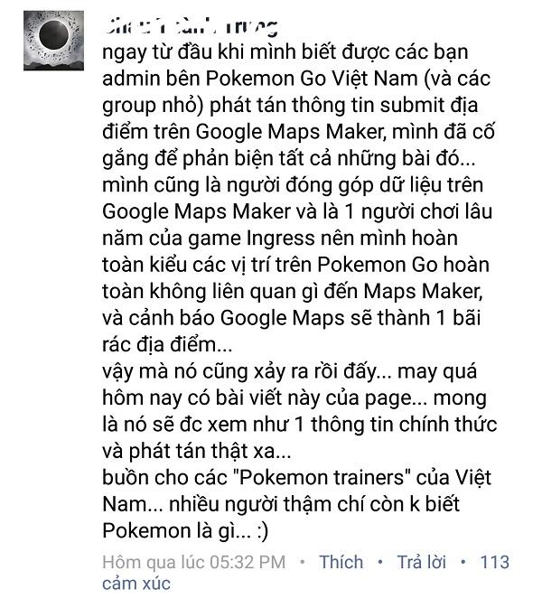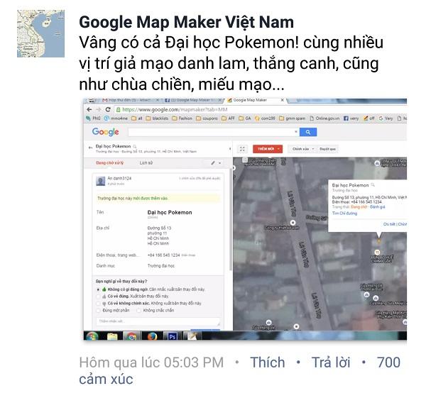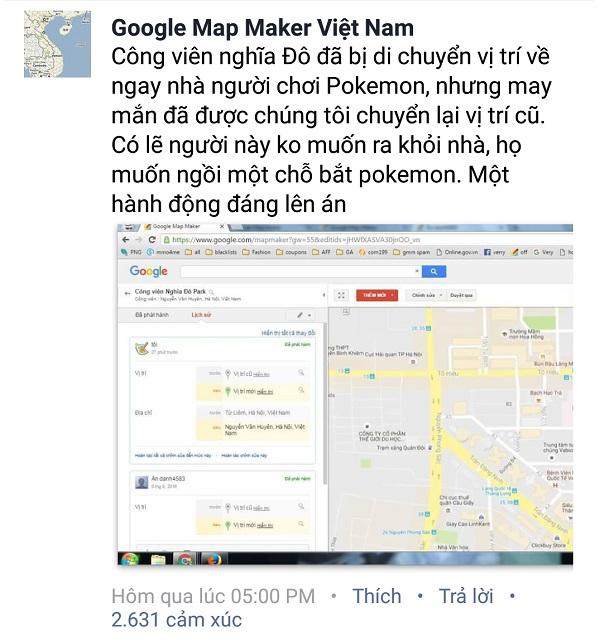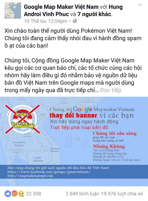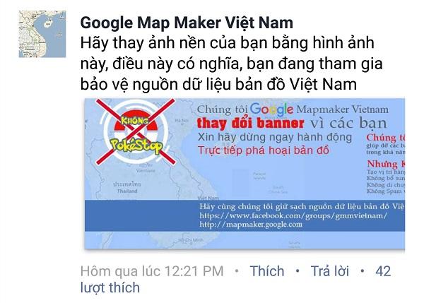 Ngày 10/8, cộng đồng Google Map Maker Việt Nam (GMMVN) đã lên tiếng “kêu gọi các cơ quan báo chí, các tổ chức cùng các hội nhóm hãy làm điều gì đó nhằm bảo vệ nguồn dữ liệu bản đồ Việt Nam trên Google maps mà người dùng trong mấy ngày qua đã trực tiếp chỉnh sửa thông qua công cụ Map Maker của Google”. Và “xin các bạn hãy dừng ngay hành động phá hoại bản đồ vì Pokémon”.