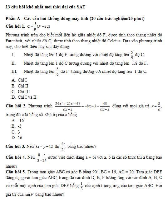Theo TS Trần Nam Dũng, 5 câu cuối của đề thi Toán năm nay rất khó. Để so sánh, ông đã tham khảo 13 câu hỏi khó nhất mọi thời đại của kỳ thi SAT. Ông nhận định mức độ khó của 13 câu thi SAT vẫn không bằng 5 câu của đề Toán THPT quốc gia 2018.