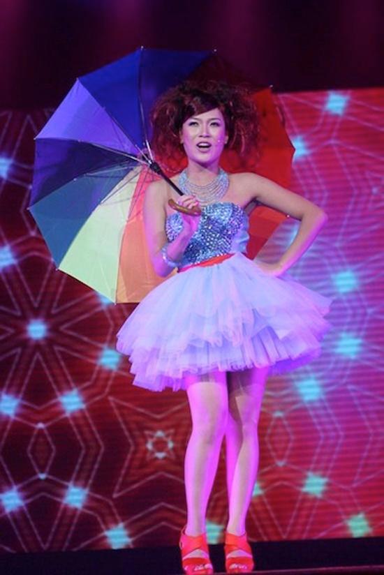 Xuất hiện trên sân khấu, cô mặc trang phục sến sẩm và để mái tóc "tổ quạ" phát