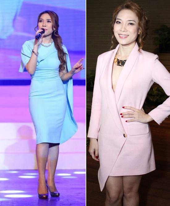 Hai gam màu xanh thanh bình và hồng thạch anh được Mỹ Tâm diện. Cô