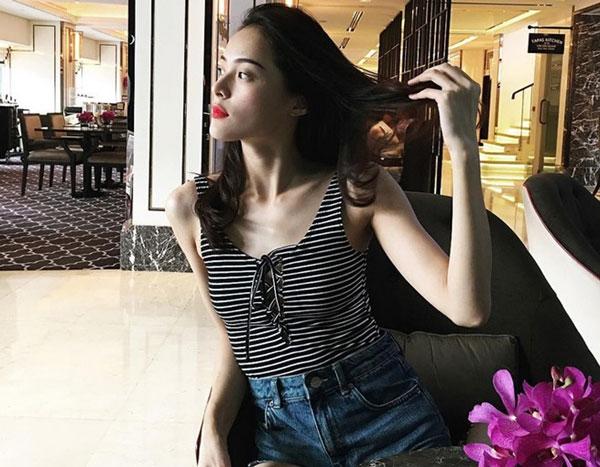 Nét gợi cảm của người tình Cường Đôla với áo buộc dây và short denim cạp cao.