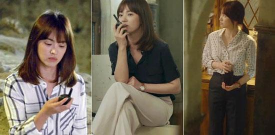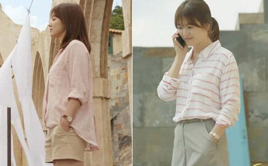 Áo sơ mi là một trong những trang phục không thể thiếu của chị em công sở ở mọi trường hợp. Đối với Song Hye Kyo cũng vậy, cô liên tục biến hóa trong những chiếc áo sơ mi, có khi đơn sắc, có khi với họa tiết kẻ sọc, thậm chí là hoa văn nhằm thay đổi hình ảnh trong phim. Cô cũng lựa chọn cách phối đơn giản như với quần tây, chân váy ngắn, quần short... nhằm khiến thân hình gọn gàng, "ăn gian chiều cao" đáng kể.
