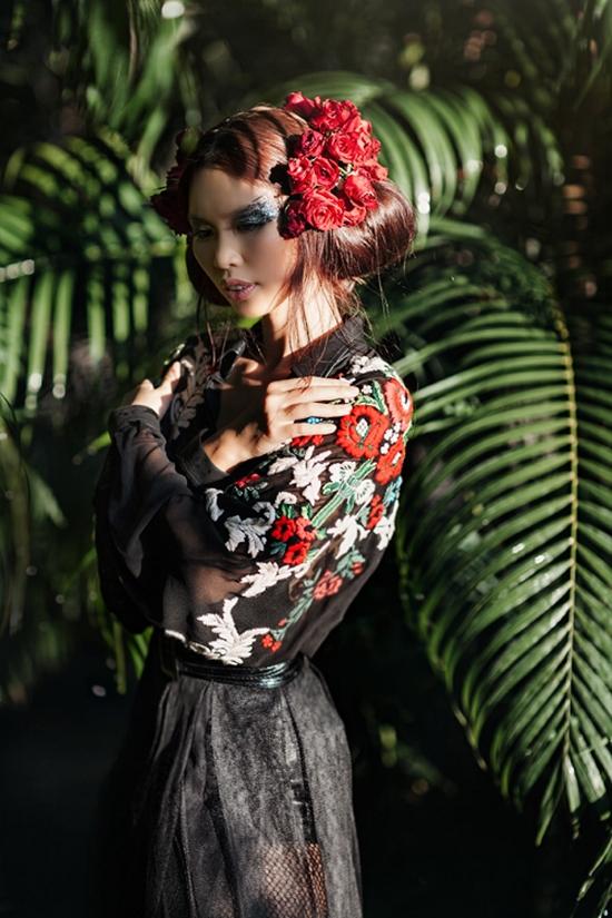 Phần thực hiện mẫu tóc sử dụng 200 bông hoa để phù hợp với thiết kế trang phục ấn tượng của NTK nổi tiếng Kelly Bùi, người vừa mang bộ sưu tập mới đi trình diễn tại Shanghai Fashion Week.