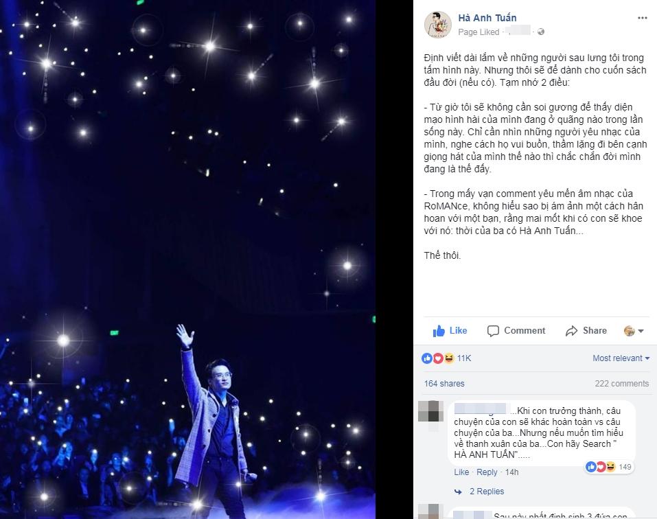 Lời tâm sự của Hà Anh Tuấn còn nhận được đông đảo sự ủng hộ từ người hâm mộ. Những bình luận dài gửi gắm tâm tư đã được để lại ngay dưới phần chia sẻ của nam ca sĩ gốc Bắc: