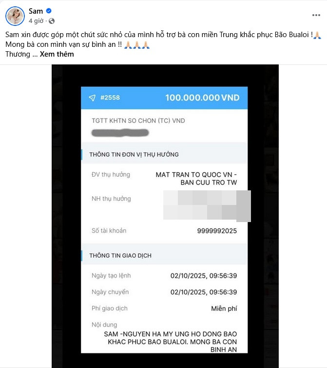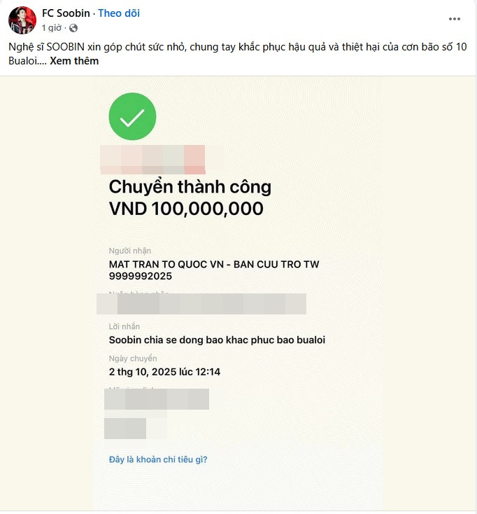 Sam và FC Soobin mỗi người gửi 100 triệu đồng san sẻ khó khăn cùng những người dân đang chịu thiệt hại lớn do thiên tai gây ra.