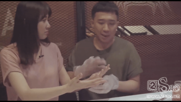 "Sao em đeo lâu dễ sợ vậy, mất bao nhiêu thời gian của anh", Trấn Thành đáp lời khi giọng ca Anh cứ đi đi đề nghị đeo bao tay để ăn. Tiếp đó, anh cười "nham hiểm: "Cảm ơn em yêu nhưng việc đeo bao tay đó là của em".