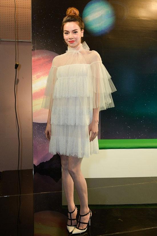 Xuất hiện với cương vị là giảm khảo liveshow 4 của chương trình The Remix mới đây, Hà Hồ thu hút mọi ánh nhìn bởi bộ váy ren màu trắng. Thiết kế váy nhẹ nhàng, xếp tầng tinh tế và thắt nơ ở cổ khiến cô xinh như tiên nữ. Gương mặt trang điểm tự nhiên, tóc búi cao càng làm "Nữ hoàng giải trí" đẹp trong từng centimet.