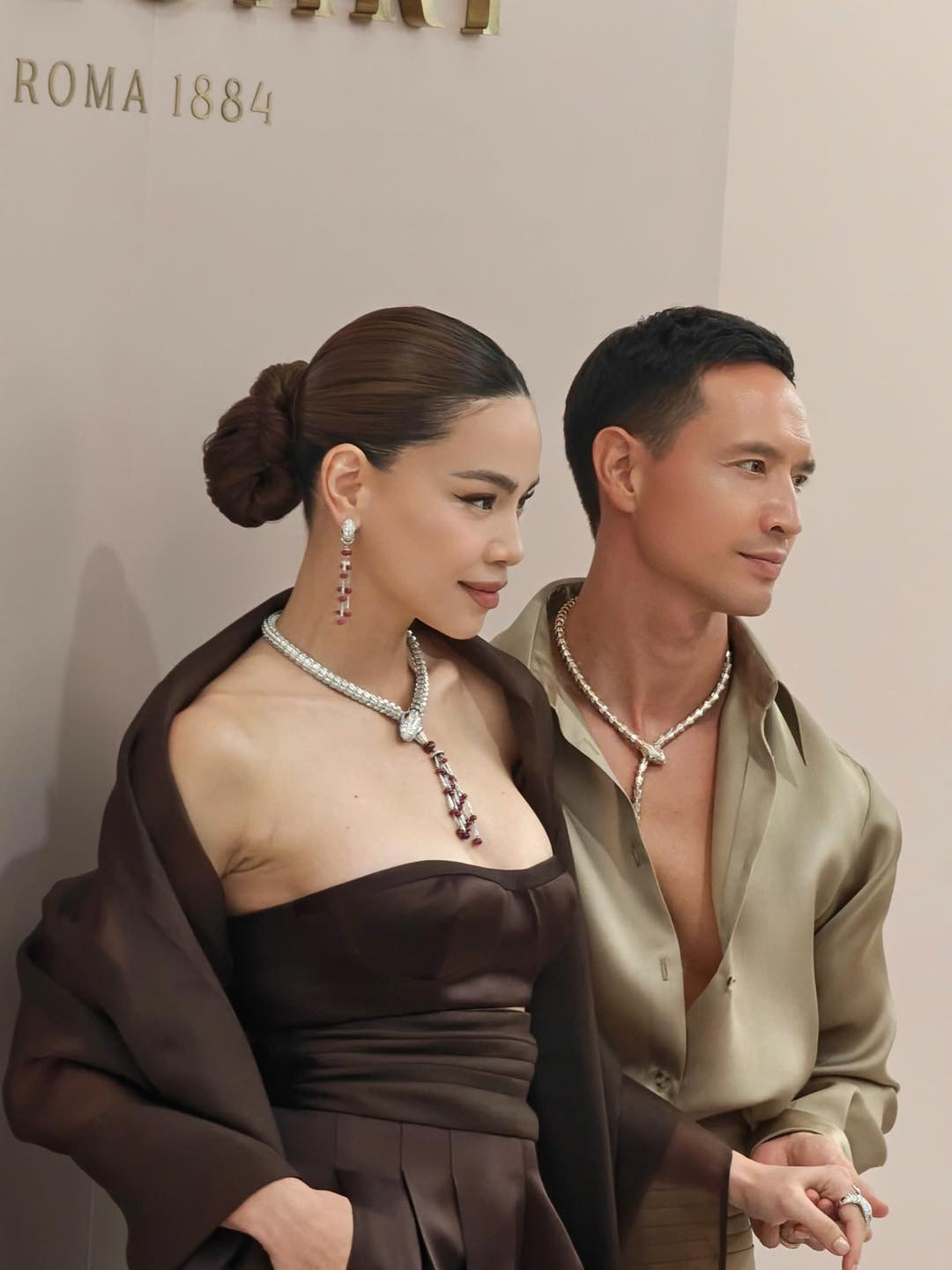 Ngay khi xuất hiện ở event, vợ chồng Hồ Ngọc Hà - Kim Lý chiếm trọn spotlight nhờ hào quang rực rỡ. Nữ ca sĩ diện set đồ màu nâu chocolate đậm khoe trọn vòng 1 căng đét cùng phụ kiện tiền tỷ. Chẳng cần trang điểm cầu kì, Hà Hồ lựa chọn kiểu tóc búi gọn gàng cùng layout trang điểm nâu tây vẫn cực kì slay.