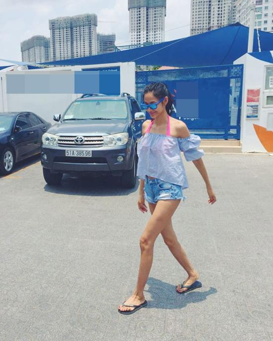 sao đình đám làng giải trí Việt. Áo trễ vai, quần short, dép xỏ ngón, kính mắt