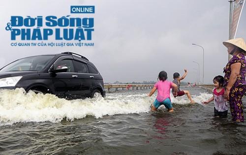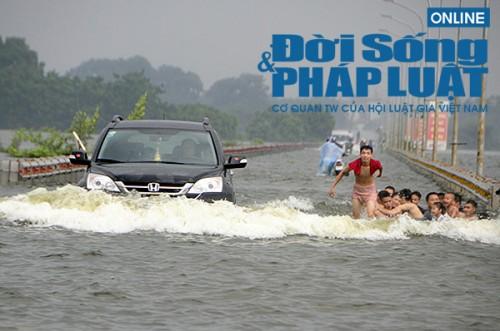 Đoạn tỉnh lộ 421B dài chừng 500 m trên tuyến đường huyết mạch nối thị trấn Quốc Oai với một số xã của huyện Quốc Oai bị ngập sâu trong nước suốt một tuần nay do ảnh hưởng của đợt mưa kéo dài.