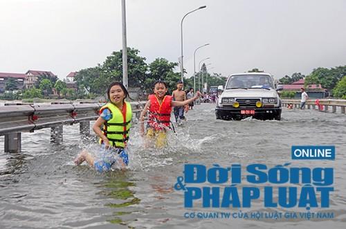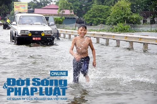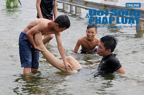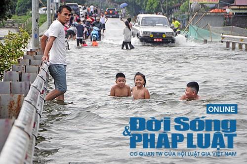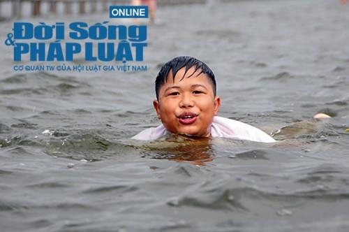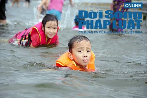 Nhiều người dân tranh thủ cho các em nhỏ ra đây bơi lội ngay trên mặt đường.