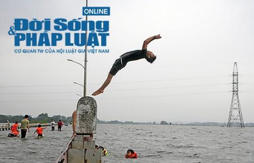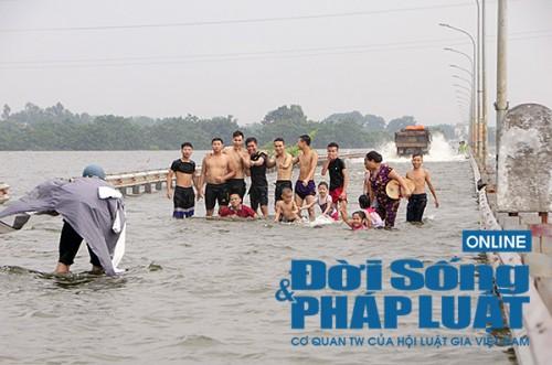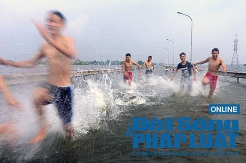 Chiều 29/7, theo ghi nhận của PV báo Đời sống & Pháp luật, rất đông người dân thôn Cấn Thượng, xã Cấn Hữu, Quốc Oai (Hà Nội) đưa các em nhỏ ra bơi lội trên mặt đường tỉnh lộ 421B, bất chấp nguy hiểm do nhiều ô tô vẫn qua lại.