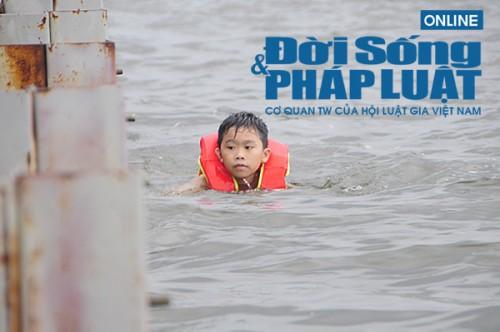 Một em nhỏ hồn nhiên bơi trên đường tỉnh lộ sau những ngày ngập lụt kéo dài.