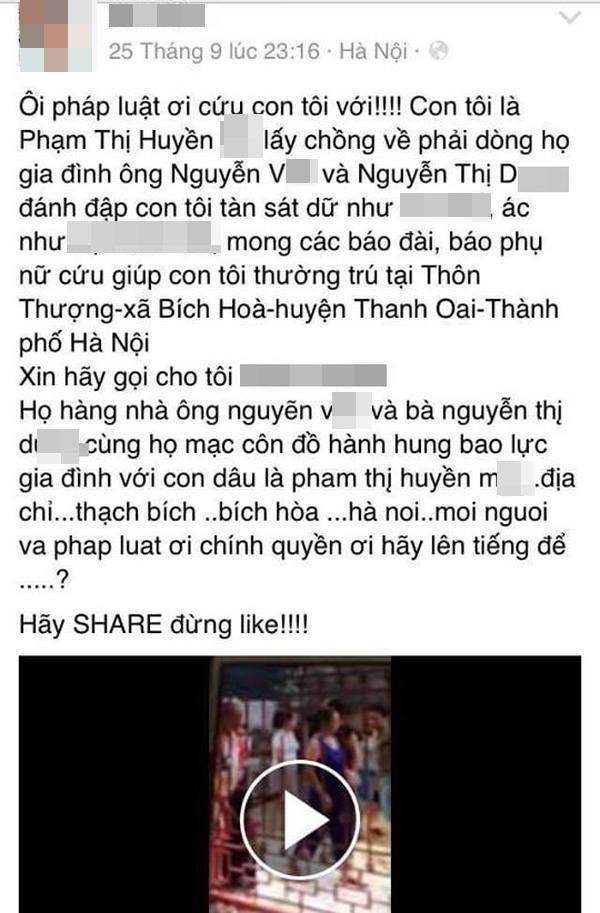 Kèm theo đoạn clip là những dòng tâm trạng với lời cầu khẩn tha thiết của chủ nhân (tự nhận là bố đẻ nạn nhân) với mong muốn pháp luật vào cuộc điều tra làm rõ sự việc. "Ôi pháp luật ơi cứu con tôi với! Con tôi là Phạm Thị Huyền M. (21 tuổi) lấy chồng về phải dòng họ gia đình ông Nguyễn V. và Nguyễn Thị D. đánh đập con tôi tàn sát...", chủ tài khoản facebook chia sẻ.