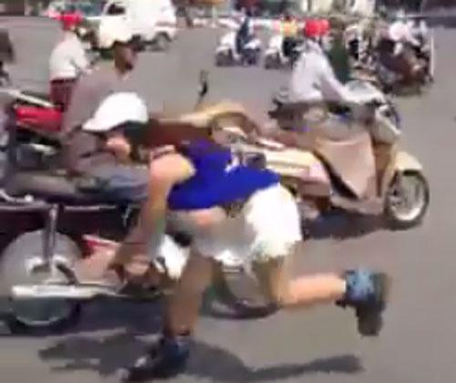 Cô gái đầu đoàn suýt va chạm với xe máy. Ảnh cắt từ clip