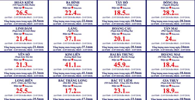 Theo Trung tâm Dự báo khí tượng thủy văn quốc gia, từ ngày 20/7 đến 5h sáng 21/7, nội thành Hà Nội đã có mưa vừa, mưa to đến rất to, lượng mưa đo được tính đến 6h sáng ở mức cao: Hoàng Mai 73,4 mm, Ba Đình 76 mm, Đống Đa 75 mm, Linh Đàm 93 mm, Láng 64 mm, khu vực Long Biên (chân Cầu Vĩnh Tuy) 76 mm, Kim Liên 67 mm, Cầu Giấy 55 mm, Hai Bà Trưng 61 mm, Hoàng Quốc Việt 63 mm, Hà Đông 103 mm, Tân Mai 57 mm … Dự báo trong sáng nay 21/7, khu vực các quận trung tâm thành phố tiếp tục có mưa.