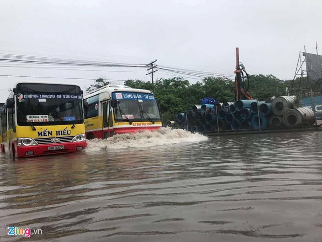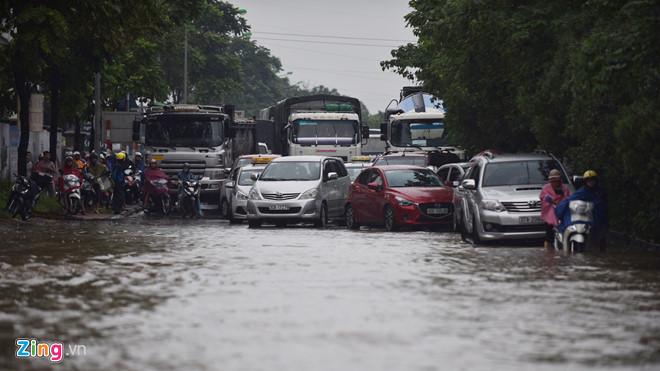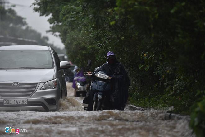 Tại Đại Lộ Thăng Long đoạn qua khu đô thị An Khánh, Thiên đường Bảo Sơn nhiều đoạn ngập sâu khiến các phương tiện di chuyển vô cùng khó khăn. Ảnh: Việt Linh.