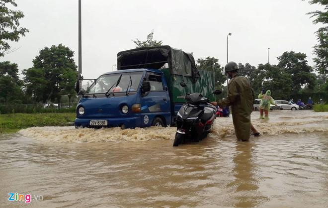 Biển nước mênh mông ở đường gom đại lộ Thăng Long, nhiều phương tiện không thể qua lại. Ảnh: Thắng Quang.
