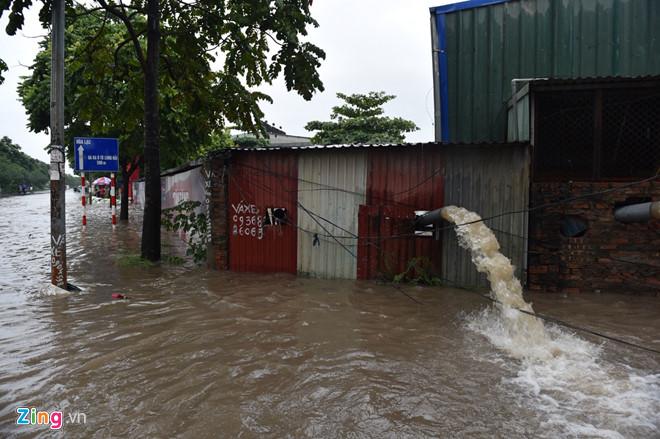 Một công ty trên đường Đại Lộ Thăng Long huy động bơm nước từ trong kho ra ngoài đường lớn và đắp kè để tránh nước tràn vào kho bãi. Ảnh: Việt Linh.