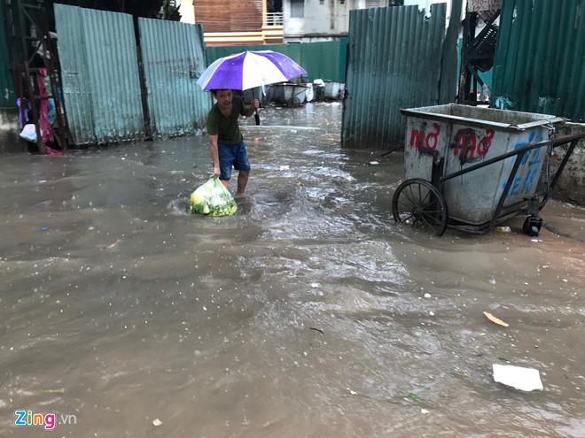 Khu tập thể nhà máy in tiền quốc gia (quận Cầu Giấy) nước ngập 30-50 cm. Theo phản ánh của người dân, do vị trí thấp và ảnh hưởng bởi công trình đường vành đai 3 kéo dài đang thi công nên nước không thoát được, ngập từ cổng nhà máy vào trong sân khu tập thể. Ảnh: Phạm Duy.