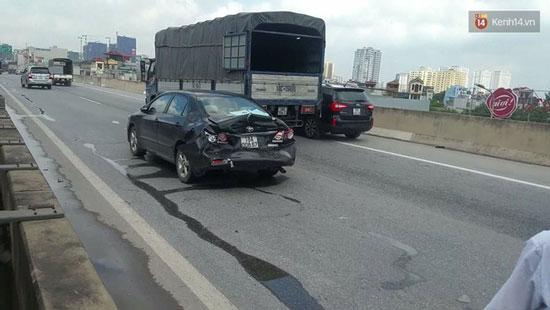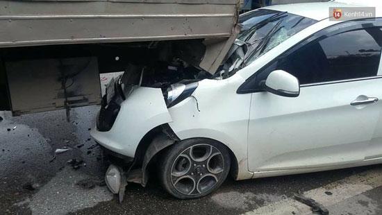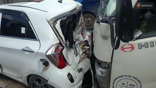 Vụ tai nạn khiến 4 xe ô tô đâm liên hoàn, hầu hết các xe bị móp méo sau vụ va chạm. Có hai xe loại 4 chỗ và hai xe tải. Trong đó, xe 4 chỗ màu trắng bị hư hỏng nặng nhất, đầu và đuôi xe bị biến dạng hoàn toàn. Rất may không ai bị thương sau tai nạn.