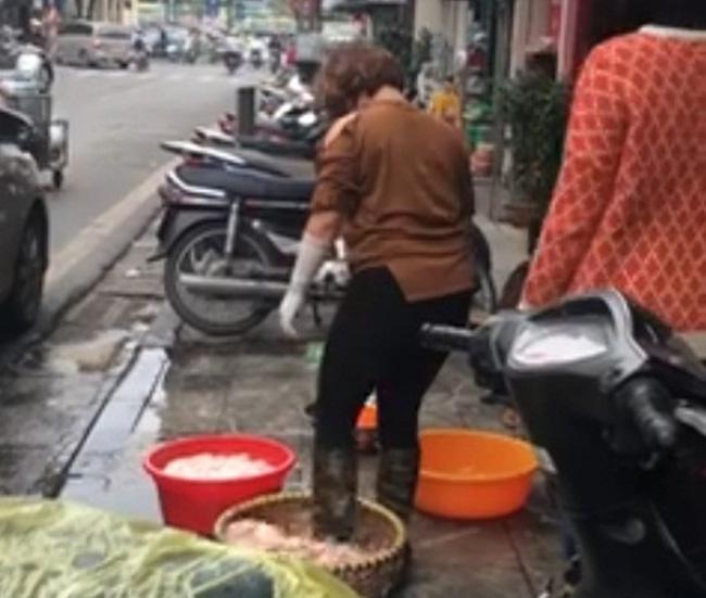 "Hôm đó, lực lượng công an ra quân xử lý vỉa hè, quán tôi đang làm lòng lợn trong chậu để chuẩn bị hàng bán cho khách. Khi công an tới, cháu tôi vừa từ trong Nam ra không biết vội đổ ụp cả chậu nước và lòng lợn vào thúng để bê vào nhà cất. Tuy nhiên, do lòng đầy ắp nước không thoát ra được, cháu tôi cuống không biết làm thế nào đã dùng chân khoắng cho nhanh chảy bớt nước ra để bê vào nhà thì một cô gái trẻ vô tình ghi lại được", bà T. kể lại.