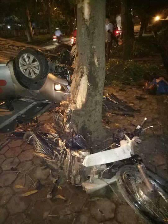 Tại hiện trường, xe taxi đâm vào gốc cây ven đường, lật ngửa, phần đầu xe hư hỏng nặng, bên cạnh là chiếc xe máy biến dạng hoàn toàn.