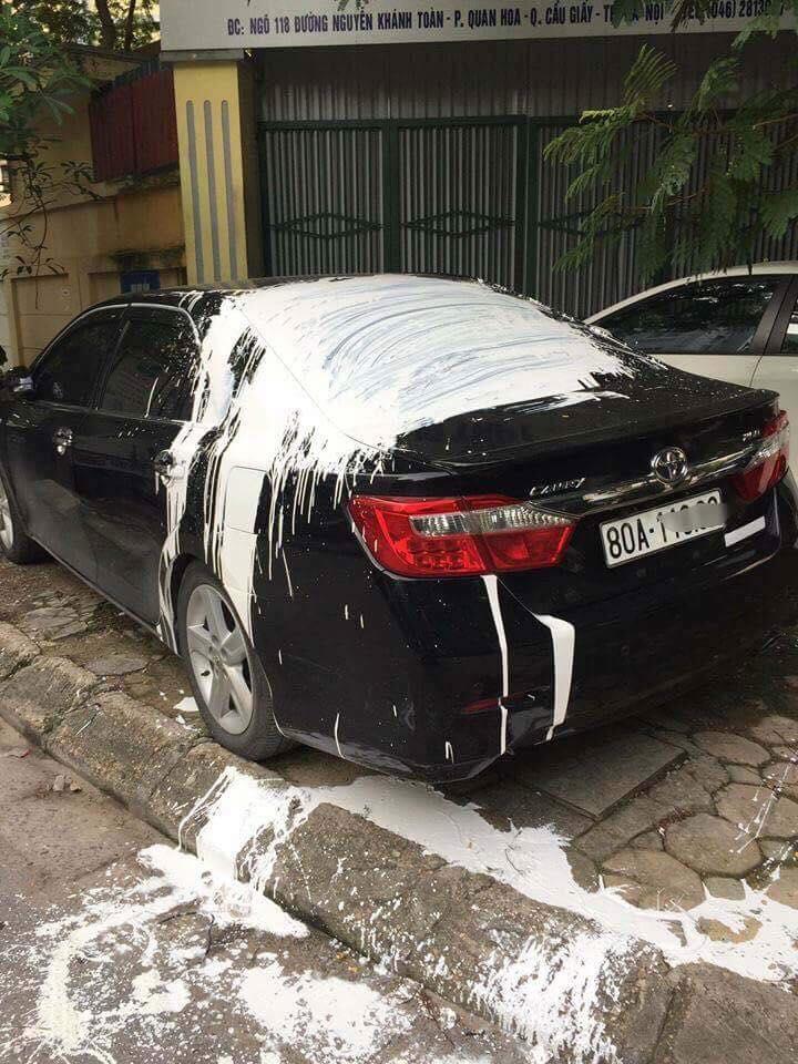 Anh Giáp, lái xe taxi ở gần khu vực cho hay, anh ra ngõ 118 đón khách thì thấy chiếc xe ô tô Camry màu đen BKS 80Axxx đậu bên vỉa hè dính đầy sơn trắng ở nóc xe.