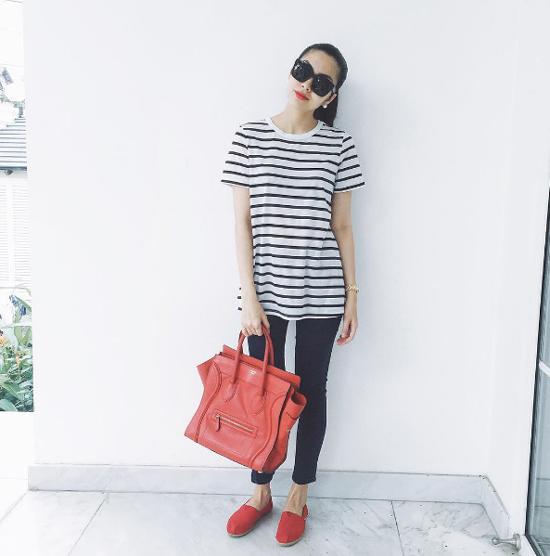 Thỉnh thoảng mới xuất hiện tại những sự kiện tầm cỡ và chủ yếu tập trung vào kinh doanh, chăm lo cho gia đình nhưng Hà Tăng luôn là cái tên được công chúng đặc biệt quan tâm. Trong bất cứ hình ảnh nào ở đời thường hay thảm đỏ, Hà Tăng đều là tâm điểm của sự chú ý. Mới đây, "ngọc nữ" một thời của điện ảnh Việt khoe phong cách giản dị và năng động với áo phông kẻ sọc ngang kết hợp quần skinny đen. Điểm nhấn của set đồ chính là đôi giày và chiếc túi đỏ rực rỡ.