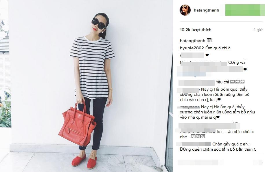 Nhiều fans đã lo lắng lên tiếng tham gia góp ý với thần tượng: Nay chị Hà ốm quá, thấy xương chân luôn rồi, ăn uống tẩm bổ nhiều vào nha chị...yêu chị. Hay: Chân gầy quá chị à... Đừng quên chăm sóc tẩm bổ bản thân Chị nhé!