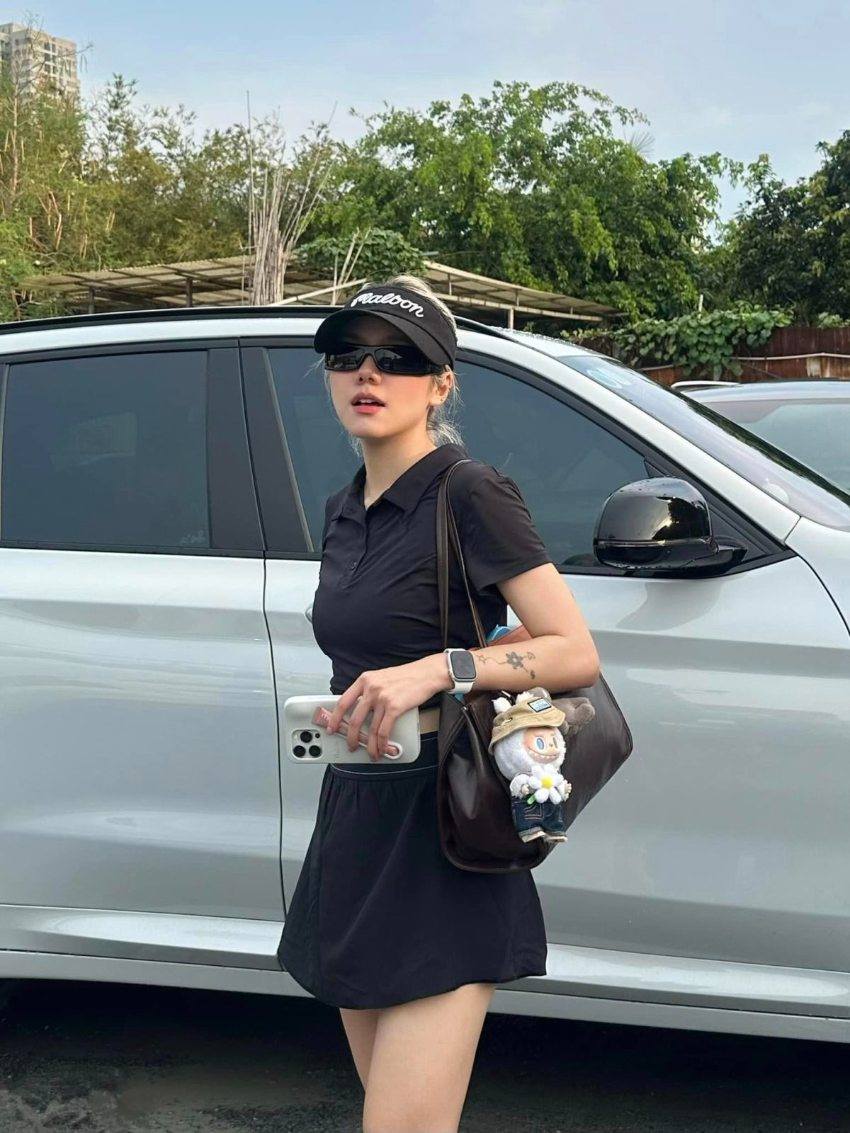 Phương Ly lên đồ thời trang đi chơi pickleball. Set đồ gồm áo polo, chân váy xòe và mũ lưỡi trai làm nổi bật thân hình mảnh dẻ của nữ ca sĩ.