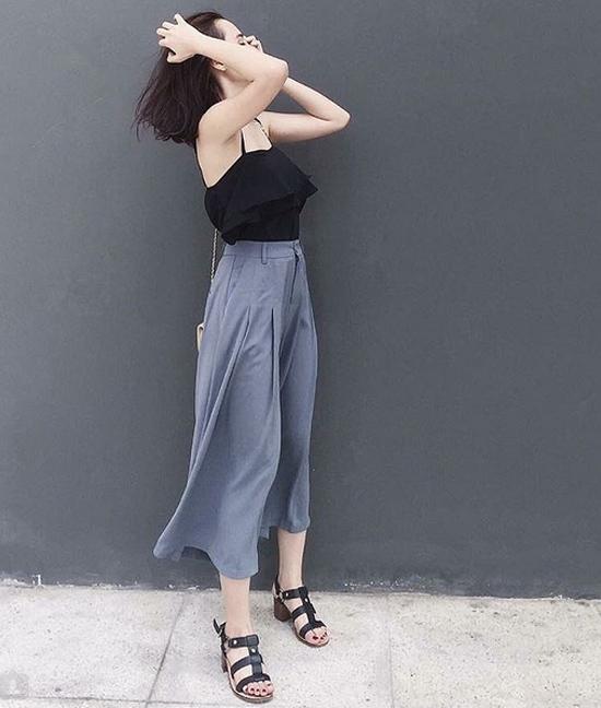Áo dây, quần culottes, xăng đan đế vuông, túi đeo vai tạo nên cho Angela Phương