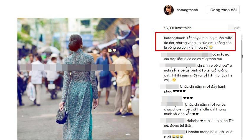 Sau những lời tâm sự về gốc gác quê hương với con trai hôm mồng 01 tết, mới đây Tăng Thanh Hà lại gây xôn xao mạng xã hội khi thể hiện sự tiếc nuốc của mình trong dịp tết đến xuân về năm nay. Nàng "Ngọc nữ" điện ảnh một thời chia sẻ ước muốn mặc áo dài truyền thống dịp này, tuy nhiên do vòng eo không còn thon gọn như xưa nên mong ước đã không thực hiện được. Đính kèm hình ảnh mặc áo dài họa tiết thả dáng những năm trước là lời bộc bạch nói lên sự tiếc nuối của bà xã Louis Nguyễn: Tết này em cũng muốn mặc áo dài, nhưng vòng eo của em không còn là vòng eo con kiến nữa rồi.