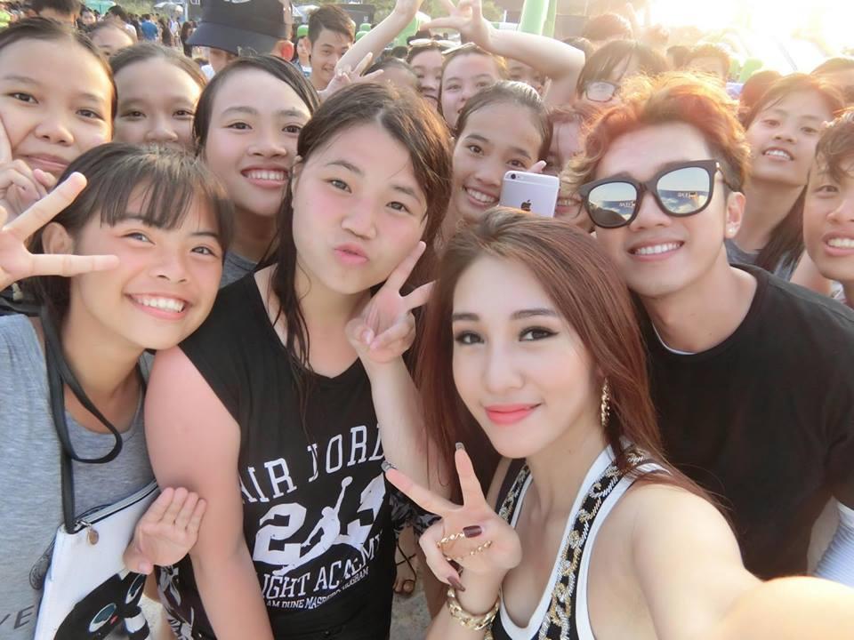 Emily Nguyễn chụp ảnh cùng fan trong một event.