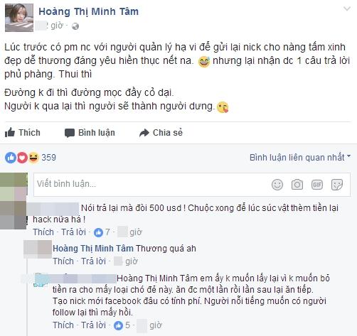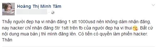 "Thấy người đẹp Hạ Vi nhận đăng 1 status 1.000 USD (22 triệu đồng) nên không dám nhận đăng, nay hacker chỉ nhận 5 triệu/chia sẻ trên Facebooker của người đẹp thôi. Bất cứ nội dung mua bán gì mình cũng đăng. Có tiền có quyền làm phiền", hacker tuyên bố.