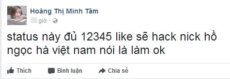 Không chỉ công khai tiết lộ bí mật đời tư của Hạ Vi, hacker này còn tuyên bố sẽ hack nick Hồ Ngọc Hà nếu như đủ lượt like động viên.