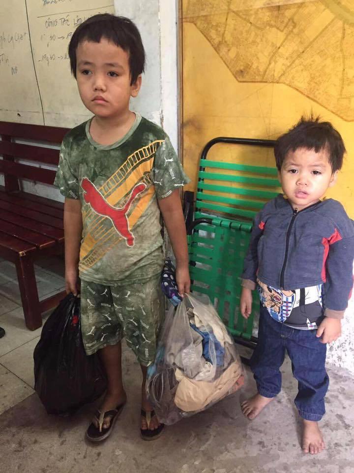 Điều đặc biệt là lúc đó bé trai 5 tuổi còn xách theo hai bịch đồ bỏ trong bao nhựa. Đó là đồ hai bé mặc thường ngày mang theo như bị người thân bỏ rơi.