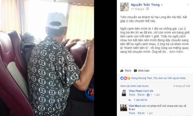 Anh Tuấn Trung kể khi đôi vợ chồng lớn tuổi bước lên xe, chỗ ngồi đã gần kín, chỉ còn hai ghế cách nhau. Thấy họ ngồi xa bất tiện, anh chủ động chuyển ghế để hai người được gần nhau. Ông bà khen anh là "thanh niên tâm lý", rồi vui vẻ hỏi chuyện. Nhờ đó, anh Trung được biết hai vợ chồng già quê ở Hải Dương, nhân dịp cuối tuần ông cho bà đi Hạ Long chơi "giải ngố". Nhìn khuôn mặt đen sạm, nhàu nhĩ, đôi bàn tay gân guốc cùng quần áo, 9X đoán ông bà làm nông hoặc công việc tay chân vất vả.