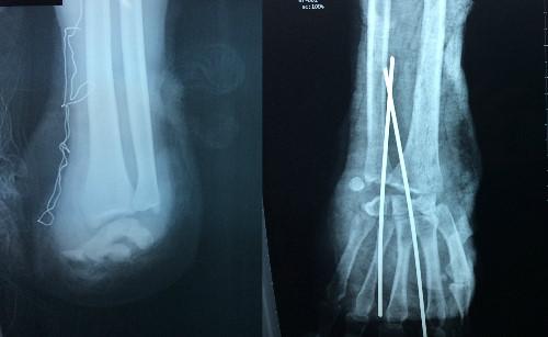 Hình chụp X-quang cho thấy tay trái bệnh nhân bị đứt lìa, tay phải đứt cơ. Ảnh: Hòa Khánh.
