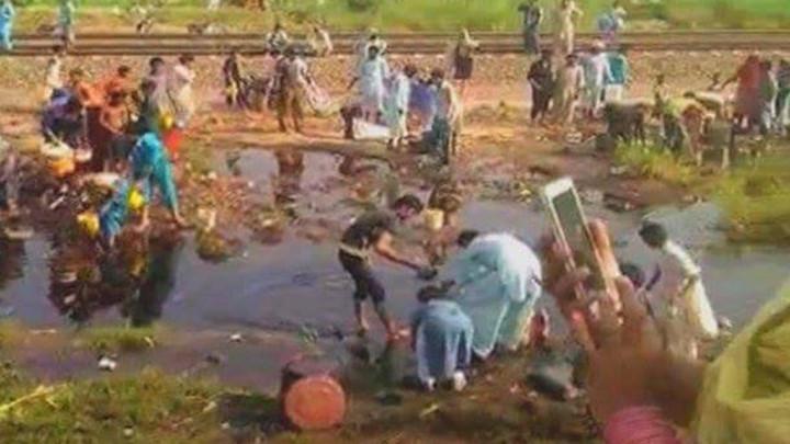 Sáng 25/6 một lượng lớn người tụ tập để thu lượm nhiên liệu bị đổ ra từ chiếc xe bồn bị lật trên một quốc lộ của Pakistan. Ảnh: al jazeera.