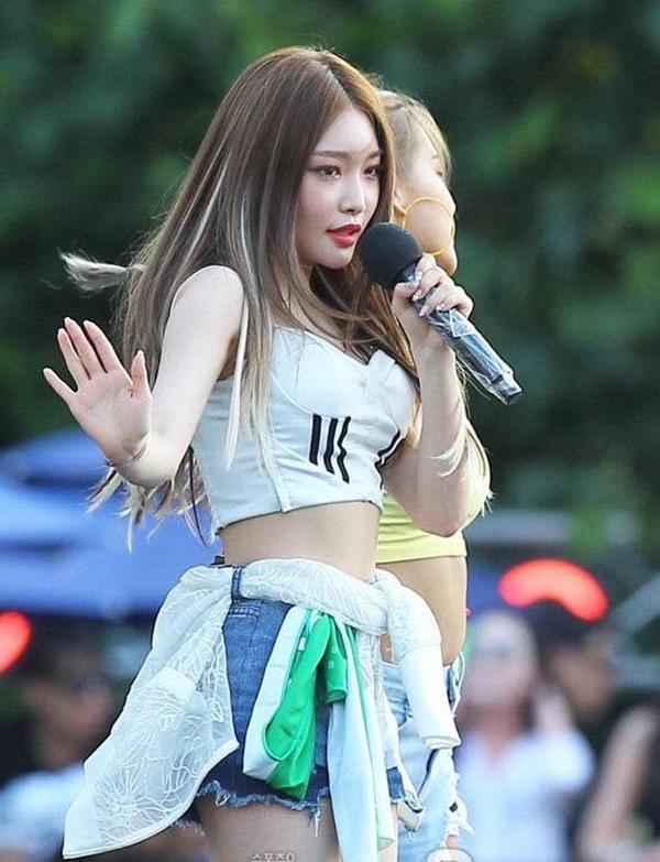 Chiếc áo hai dây vốn sexy khi bị thấm nước càng khiến Sunmi thêm táo bạo trên sân khấu. Cô khoe vòng một gợi cảm và đôi chân dài trong những màn vũ đạo của mình.