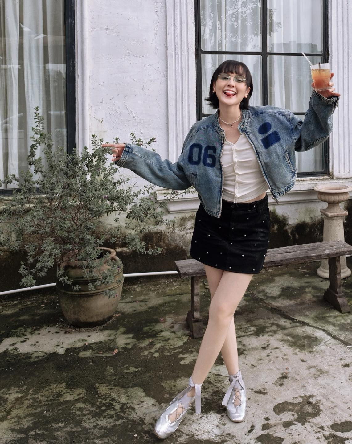 Không cầu kì như những bộ ảnh sinh nhật trước, lần này Hải Tú ghi điểm với phong cách năng động đời thường. Cô diện áo trắng phối cùng chân váy mini và áo khoác denim. Nữ người mẫu khoe trọn visual tươi trẻ, rạng rỡ, tràn đầy sức sống. Ngoài ra, cô còn ghi điểm với mái tóc ngắn cùng mái thưa che khuyết điểm trán hói.